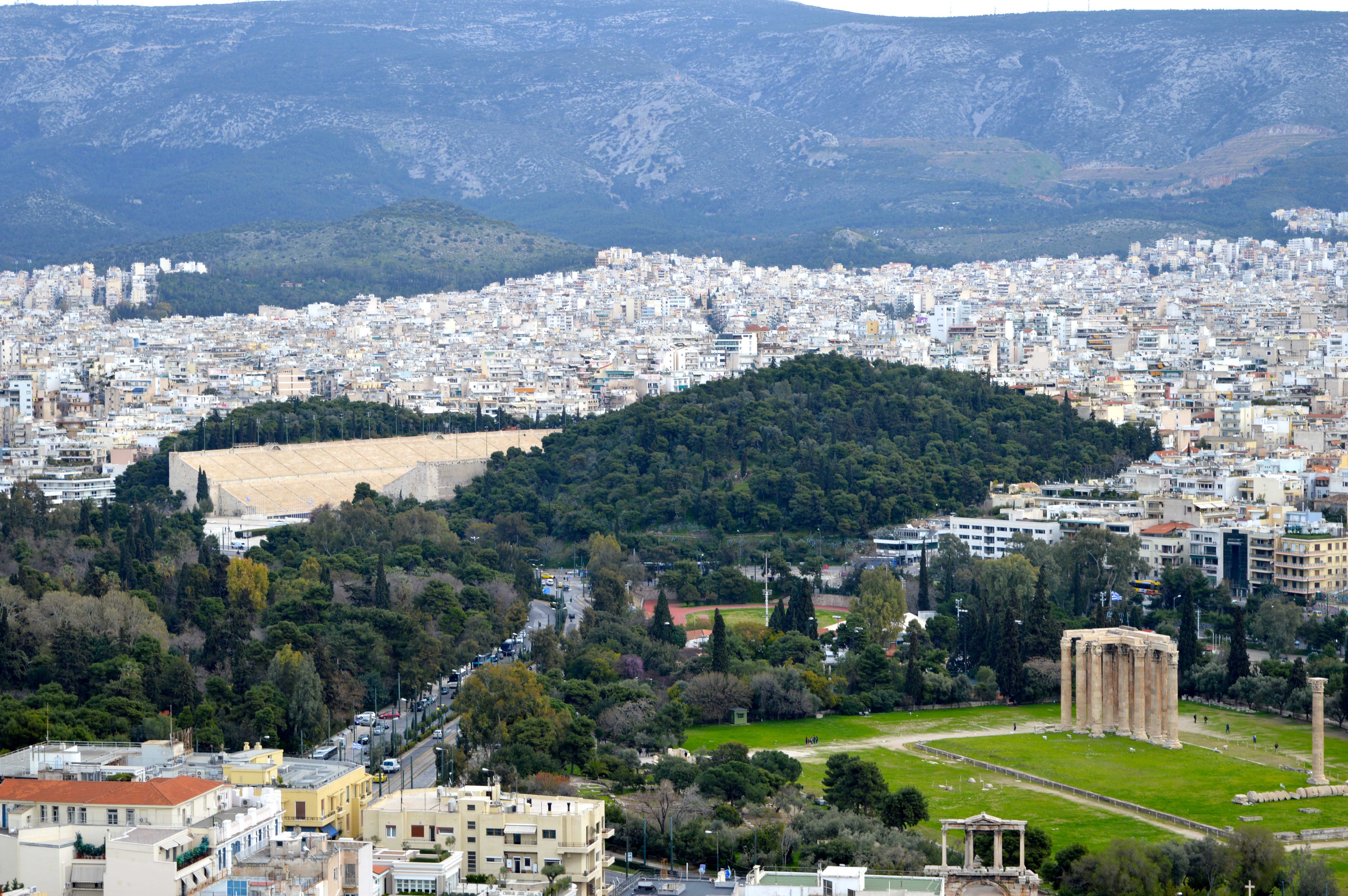 Auch Richtung Osten eröffnet sich einem ein wunderschöner Ausblick, der neben dem Tempel des Zeus auch das Panathinaiko-Stadion umfasst.