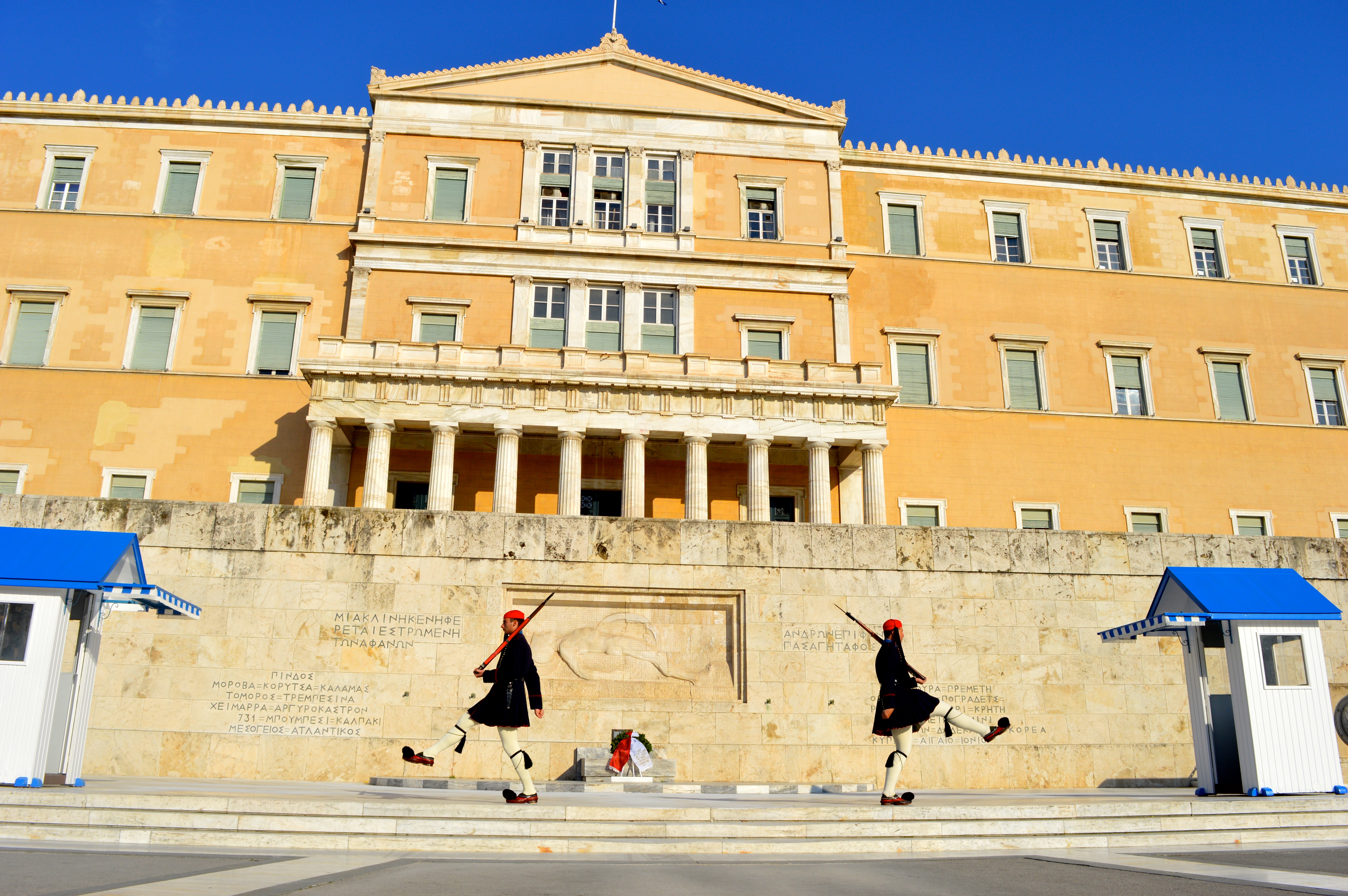 Die Evzonen, eine Eliteeinheit der griechischen Armee, beschützen das dortige Grabmal des unbekannten Soldaten im stündlichen Wechsel. Ähnlich wie in Monaco verziehen sie keine Miene und nehmen ihre Aufgabe sehr ernst.