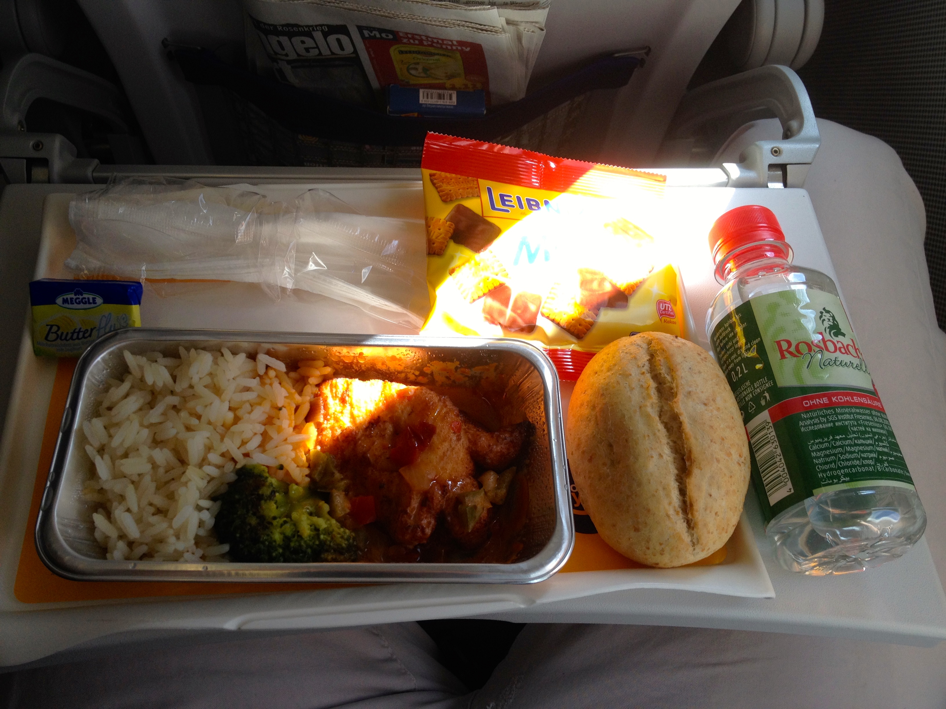 Auf dem Hinflug gab es Hühnchen mit Gemüse und Reis, auf dem Rückflug Nudelauflauf.