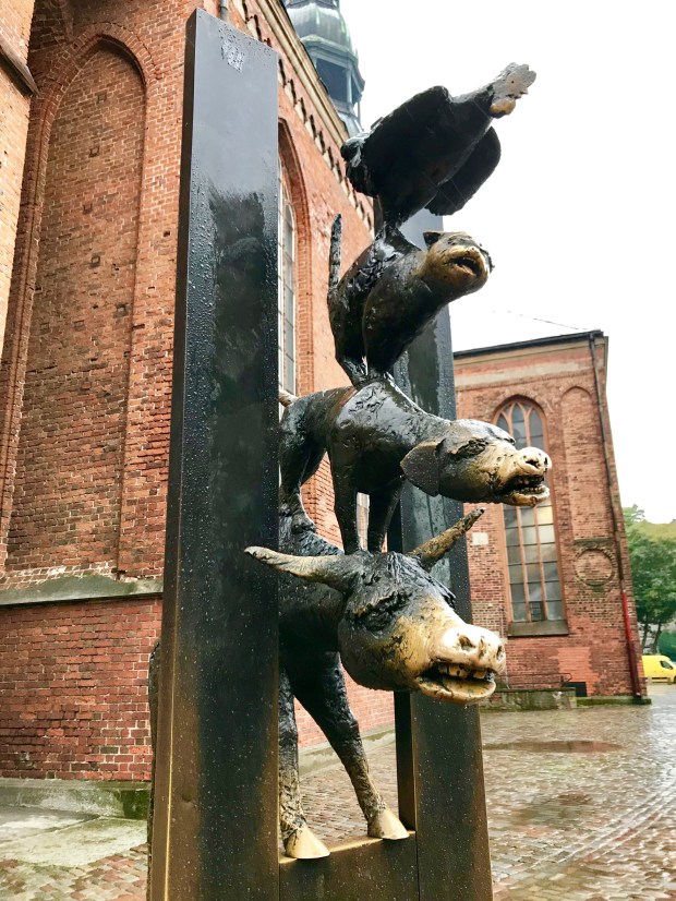 No, we´re not in Bremen – ein, wir sind nicht in Bremen – in front of the St. Peters Church there is a replica of the Bremen Town Musicians in homage to the German twin city.